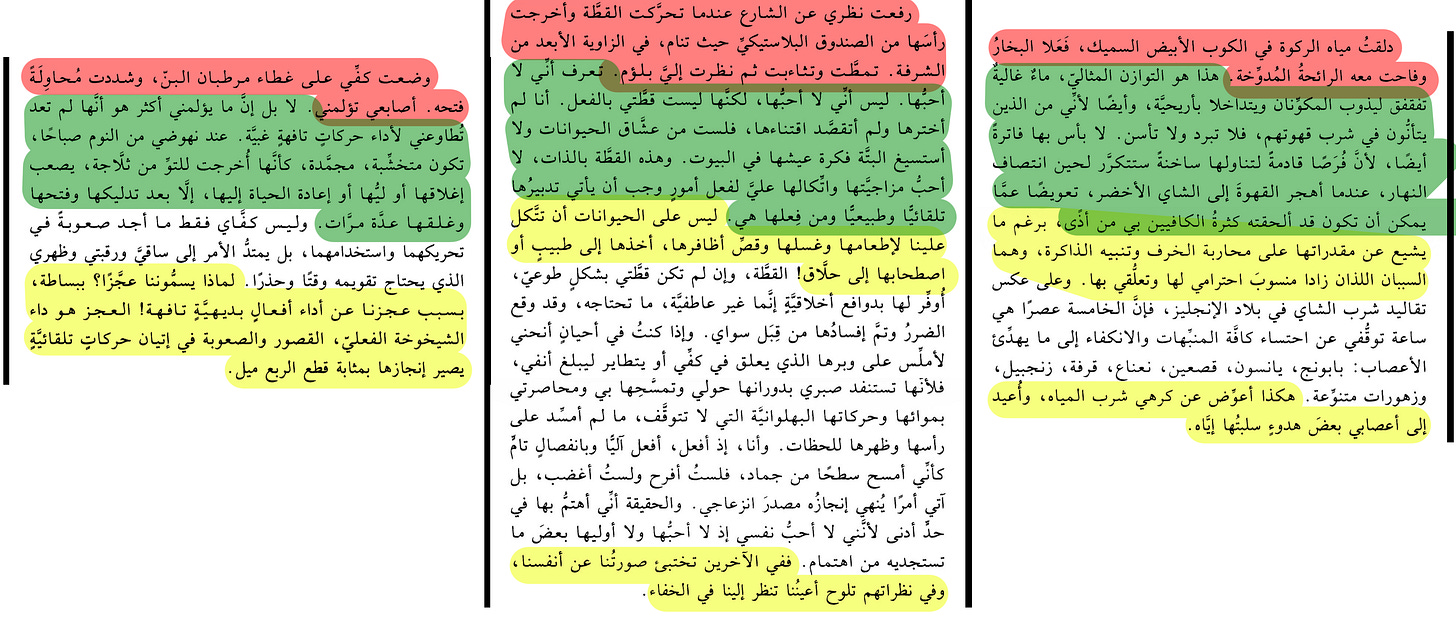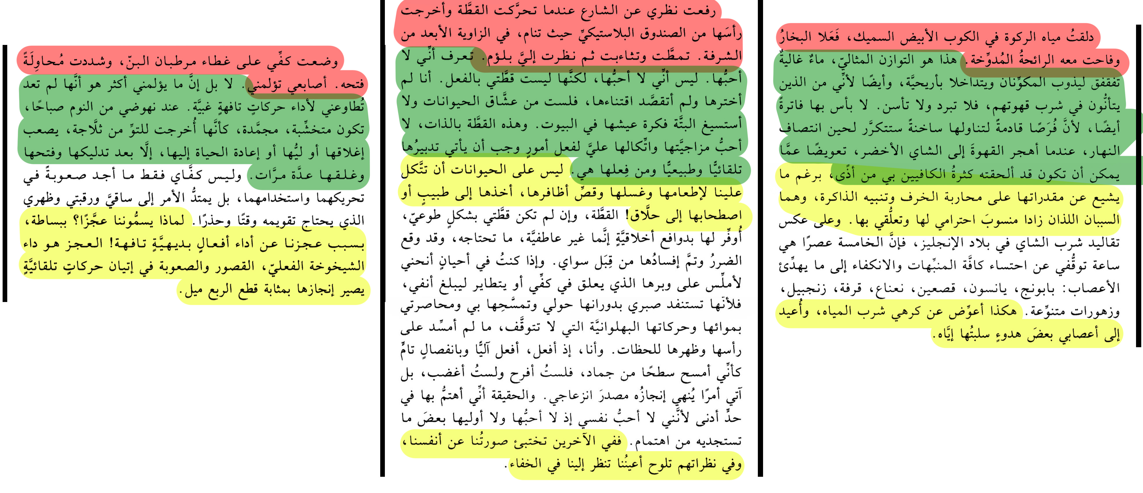 تجدون في الصورة ثلاثة برغرافات مختلفة ومتلاحقة تقريبًا. بالأحمر حددت الحدث المضارع، وبالأخضر الانكشاف التبريري أو الوجودي، وبالأصفر الذكرى أو التأمل. تخيلوا أن هذا القالب هو ما يحضر في أغلب صفحات الرواية. ما يكفي؟ طيب، هنا مثالان آخران من الصفحات الأخيرة، وتجدون بوضوح تكرار الحدث متبوعًا بالانكشاف التبريري أو الوجودي، ومن ثم التأمل: