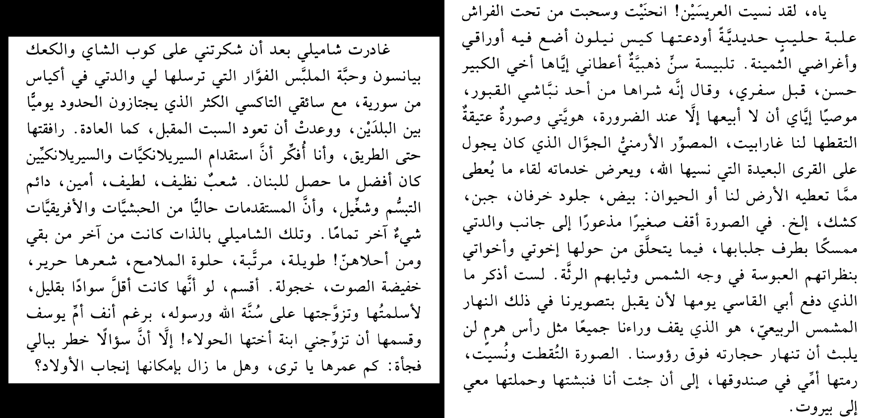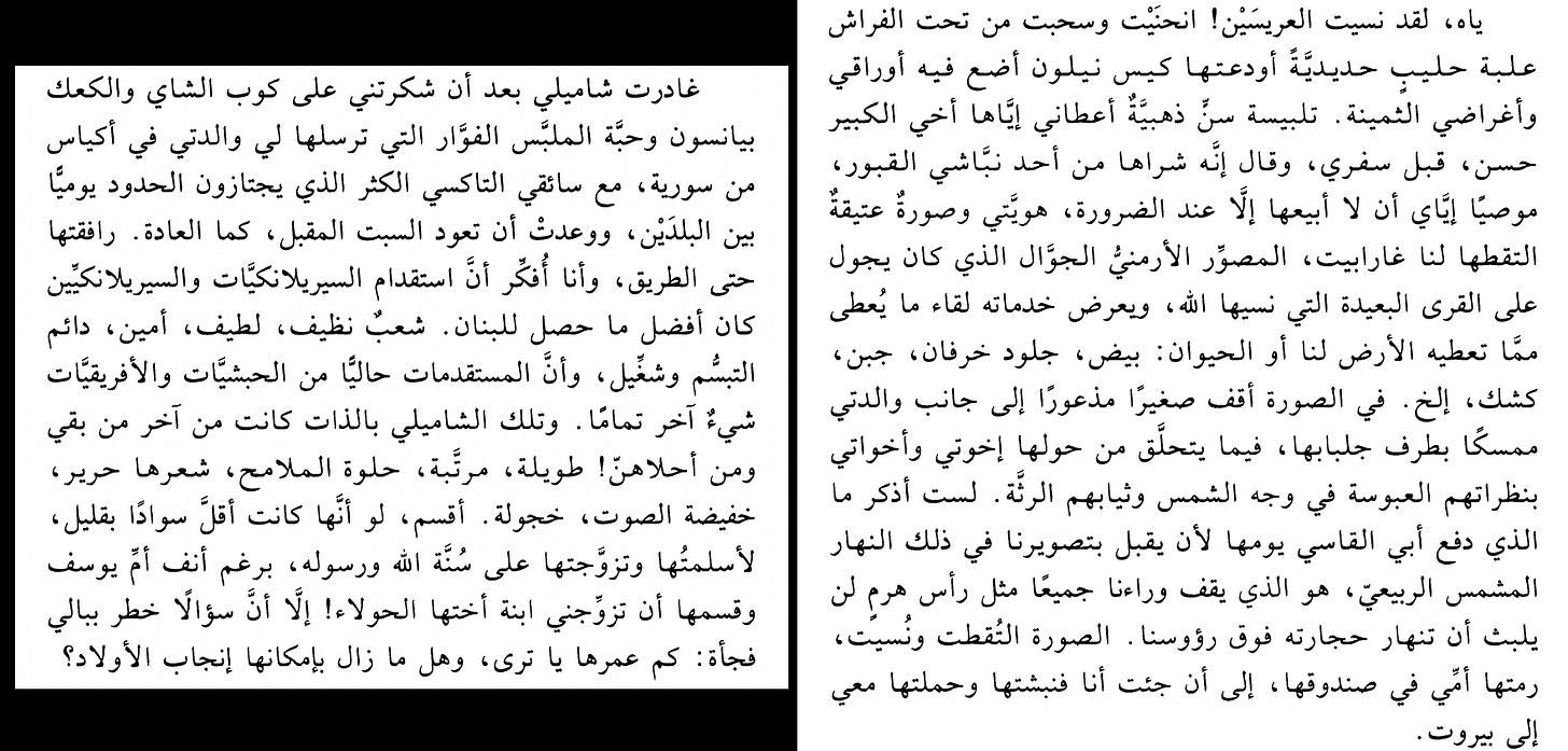 يمكنني كتابة أربعة برغرافات على الأقل حول البناء المتضعضع لشخصية مي وشبحها، وعن انفراط العلاقة ما بين ثيمات الرواية وشكلها. يمكنني مثلًا قول أن الغيبة المزعومة لمي، والتي يحاول النص مرارًا إقناعنا بأنها شيء محوري ومهم لفك طلاسم الرواية، ليست سوى فكرة ناقصة وعبيطة. سيتنبه القارئ من البداية لتمحور ذكريات مي حول مرحلتين رئيستين من حياتها، مرحلة الطفولة ومرحلة ما بعد الزواج والأمومة. أي أن القارئ سيتنبه لوجود “فجوة” في الذاكرة. لكن رغم إشارات السرد المتكرر لغيبة مي (والتي افترضت شخصيًا أنها غيبوبة وحسب)، ليس هنالك ما يثير فضول القارئ تجاه تلك الحقبة في حياتها ولا تجاه عواقبها، إذ يستقيم النص فعليًا بها وبدونها. كما يمكنني سحب نقطة السارد المُعلِّم لأقصاها عبر تبيان تحول الثيمة لفضاءٍ شروحي (commentative) تتماهى معه المؤلفة ذات القناعات الخاصة وشخصية مي التي يفترض أنها جاوزت الثمانين. ولا أوضح على ذلك مثالًا من ضربات الخشة التي ترد في النص حول المهاجرين السوريين -من أمثال يوسف الناطور- والتصورات النمطية حول وجودهم في لبنان وتاريخ علاقات الشعبين، إضافة للمقارنات المختلفة ما بين سورية ولبنان. وسأستغل ضربات الخشة هذه للتساؤل حول أسباب غياب العامية عن أغلب حوارات الرواية حتى حلول فصل يوسف، وعما إذا كان حضور العامية ذا صلةٍ برسم التباين الجوهري بين ثقافتين.
