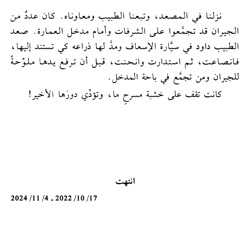 لا مجال هنا لافتراض ورود الهامش على لسان مي الشخصية أو مي الساردة أو مي الشبح أو يوسف، ولا لافتراض كونه تقنية تخدم العمل. من قرر إقحام هذا الهامش التوضيحي هو المؤلفة نفسها، والتي لم تحضر بهذا الشكل الفج داخل عالم الرواية حتى الآن. والمضحك أن الصفحة التالية والأخيرة من الرواية تحمل تدخل المؤلفة الآخر، حين تنهي النص بكلمة “انتهت” وتحديد الفترة الزمنية التي كتبت الرواية -على ما يبدو- فيها “١٧/١٠/٢٠٢٢ - ٤/١١/٢٠٢٤”.