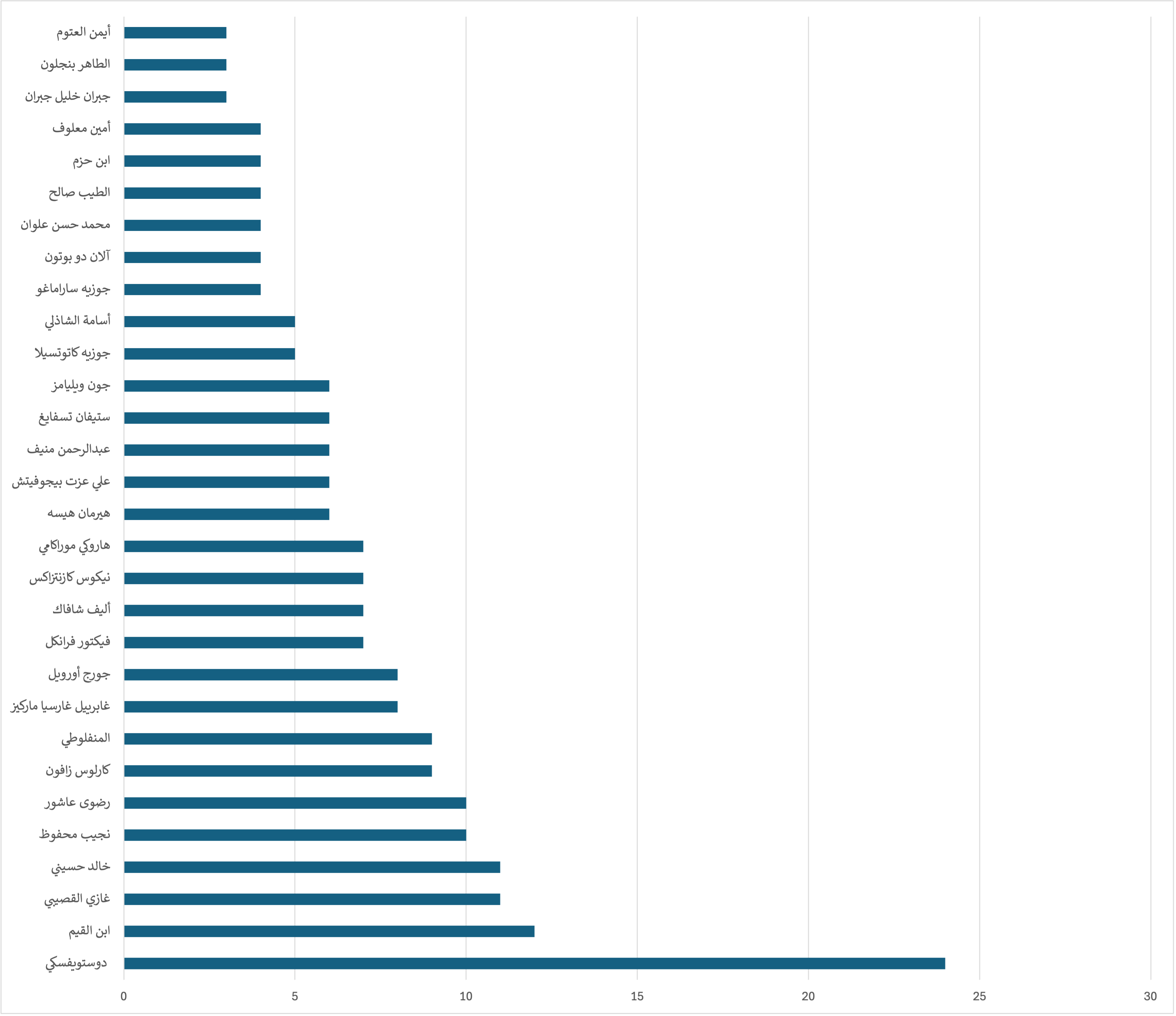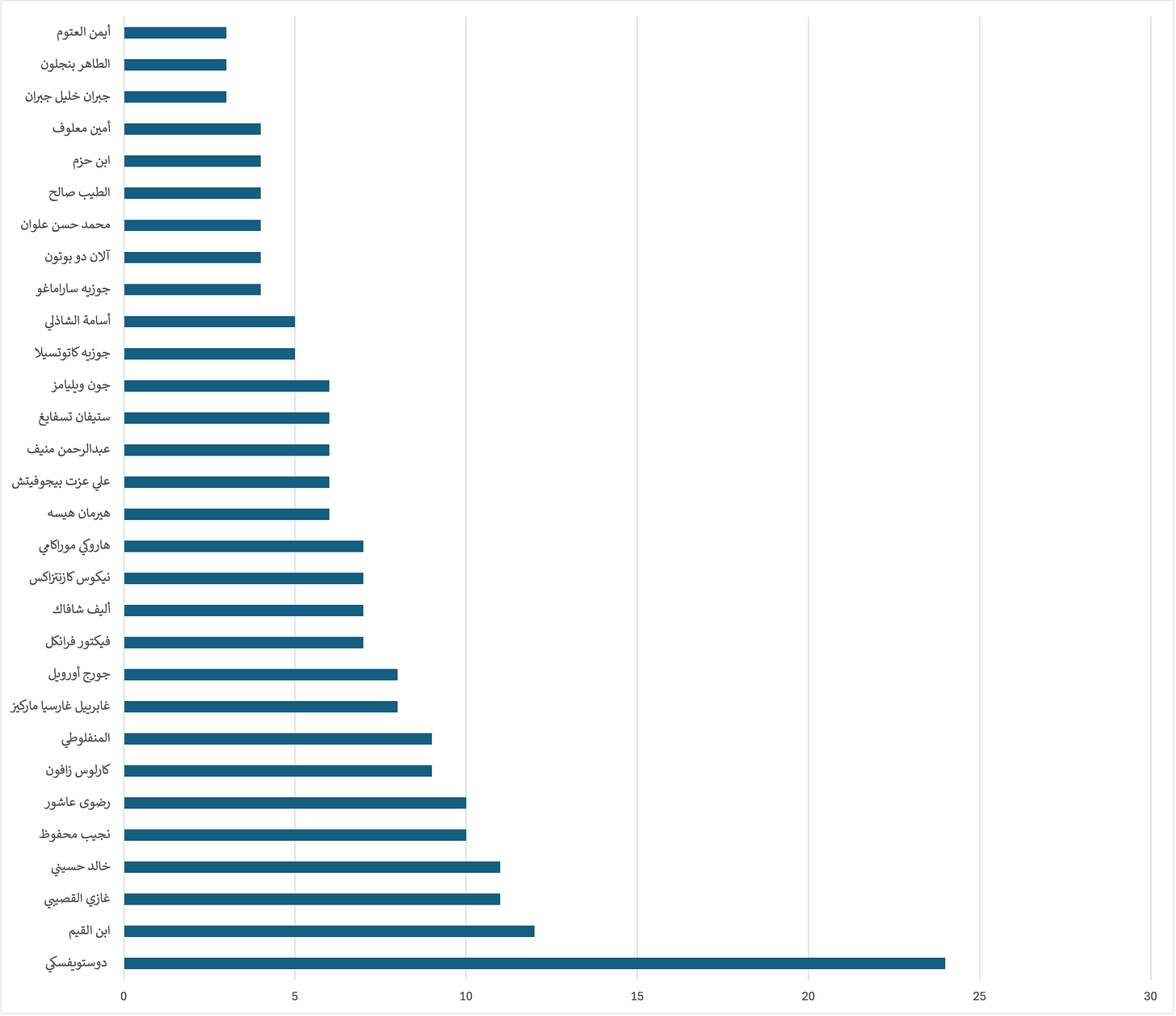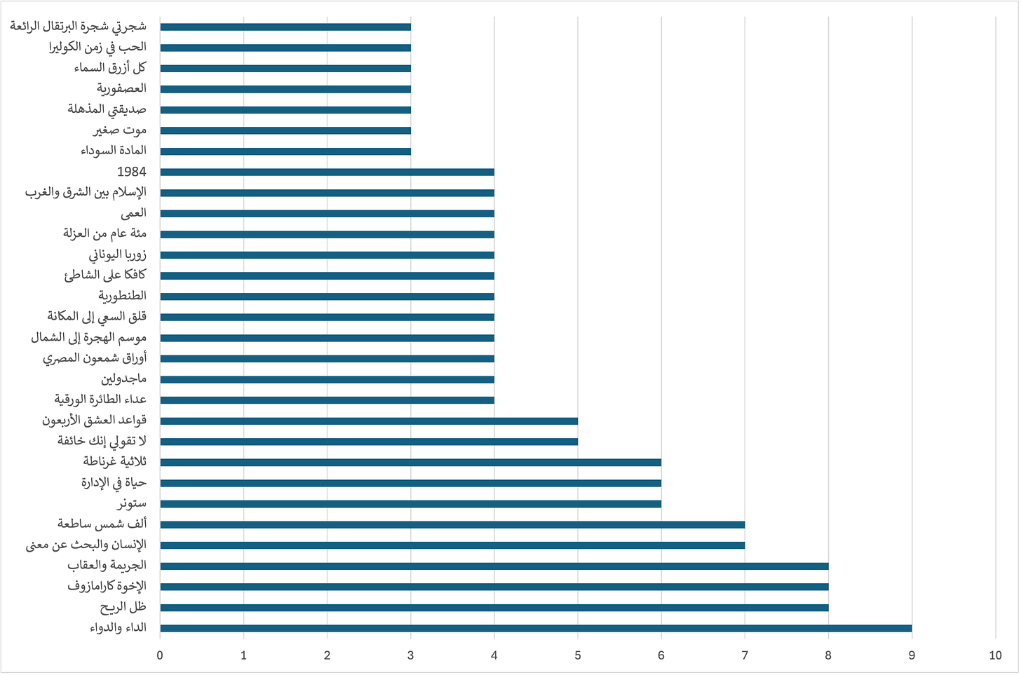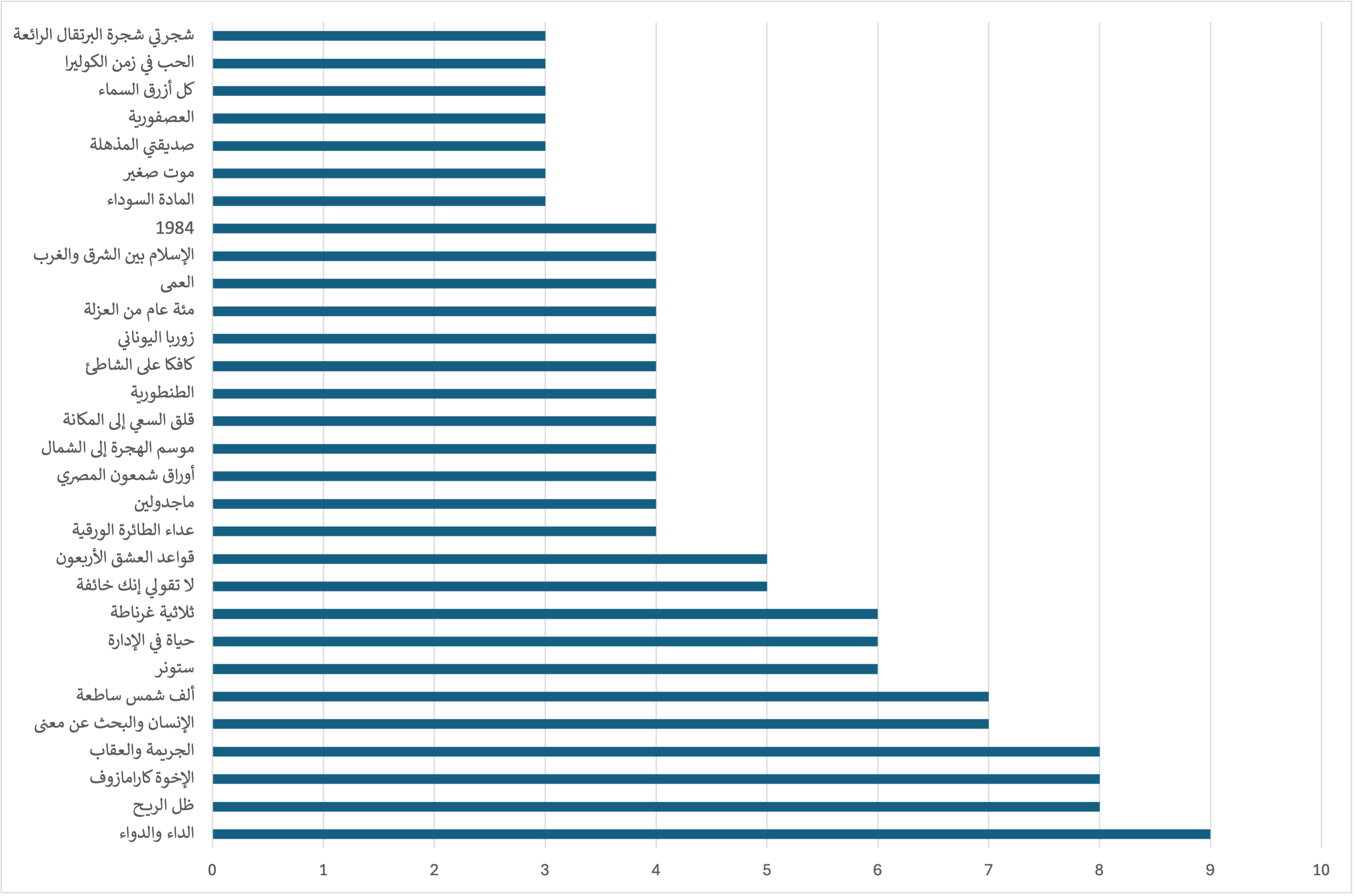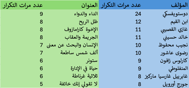 بلغ عدد الكتب النهائي ٥٤٥ كتابًا. وقتما حذفنا العناوين المكررة، سنجد أن الرقم الفعلي لا يتعدى ٣٧٨ عنوانًا مكتوبين على يد ٢٨٨ مؤلف. يعني، في حين احتوت كل قائمة على ما معدله ١٠.٢ كتابًا (هناك من أراد الهياط بأكثر من عشرة كتب)، نجدها تحتوي إحصائيًا على ٧.١ كتابًا مقسمة على ٥.٤ مؤلفًا. وبصياغة ثالثة، تبلغ نسبة العناوين المكررة ٣٠,٦٤٪ من المجموع. من باب التسلية، هنا أكثر العناوين والمؤلفين تكرارًا قائمة وبيانيًا (هناك برغراف زيادة بعد الصور، لا تنحاشون):
